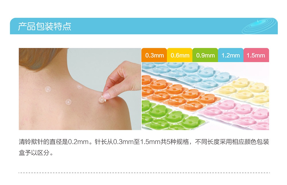 撳針是一種創新型皮內針,具有安全,方便,舒適,無創痛等特點。2002年開始研發,2004年正式在日本上市。撳針直徑均為0.2mm。針長從0.3mm至1.5mm共五種規格。按照日本QMS(醫療器械生產質量管理體系)生產。獲得美國FDA認證,歐洲CE認證,SFDA認證及ISO13485質量體系認證。